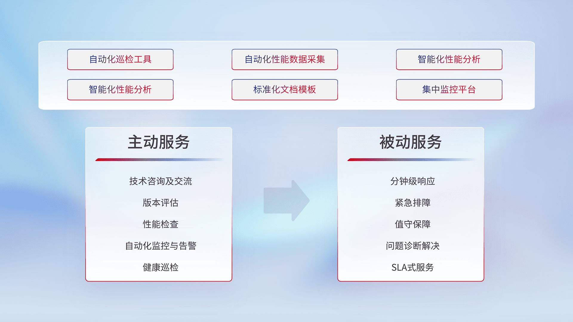 智能化工具和标准化文档,,保障服务质量,,提供主动服务(包含技术咨询、、版本评估、、、性能检查、、、自动化监控与告警、、、、健康巡检)和被动服务包含(分钟级响应、、、、紧急排障、、、值守保障、、、问题诊断解决、、、SLA服务)。。。。